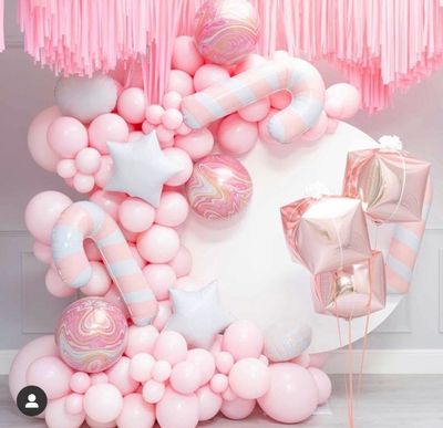 - Фольгированных шаров в виде леденцов трость и фольгированных звёзд и фонтан из трёх фольгированных кубов