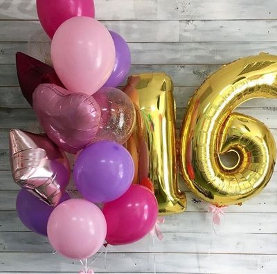- Фонтан из тринадцати шаров (фольгированное сердце, 2 фольгированных звёзды без рисунка, 3 шара с конфетти, 7 шаров пастель)