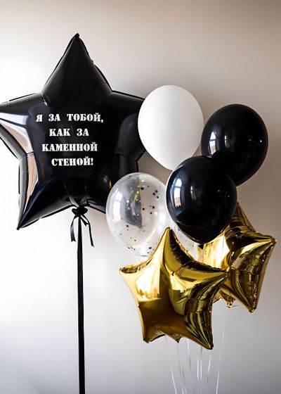 - Фонтан из семи шаров (фольгированная звезда без рисунка, 2 шара с конфетти и 3 шара пастель)