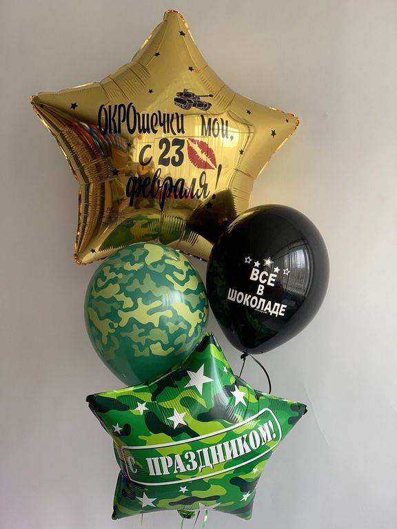 - Фонтан из четырёх шаров (большая фольгированная звезда с надписью, средняя фольгированная звезда камуфляж, шар латексный с надписью и шар камуфляжный латексный)