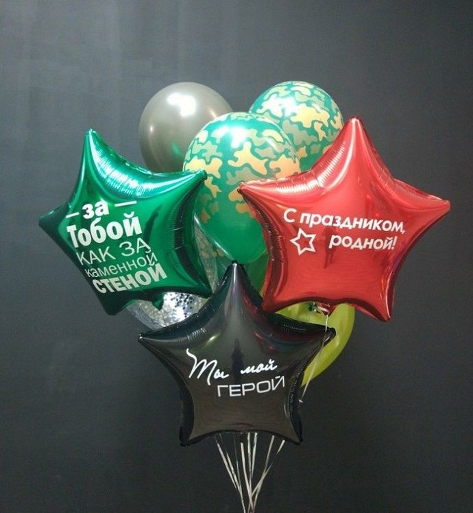 - Фонтан из девяти шаров (3 фольгированные звёзды с надписью, шар с конфетти, 3 латексных камуфляжных шара, 2 шара металлик)