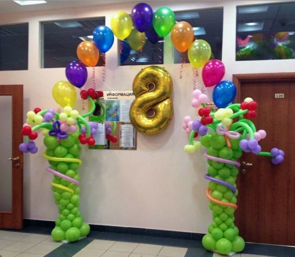 - Арка из 11 гелиевых шаров на стойках с цветами из воздушных шаров