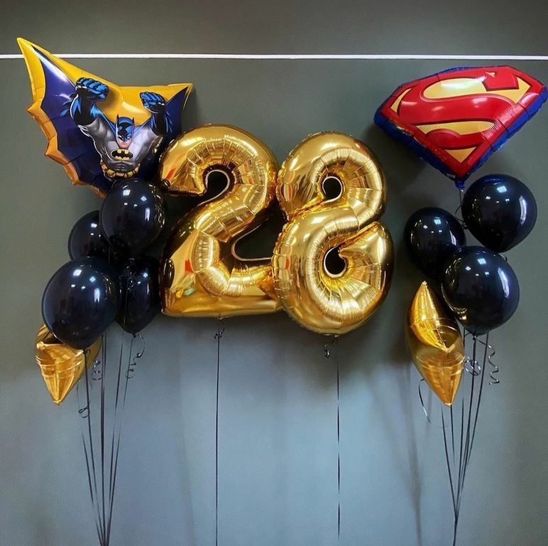 - второй фонтан из пяти шаров (фольгированный шар эмблема супермена, фольгированная звезда без рисунка, 3 шара пастель)