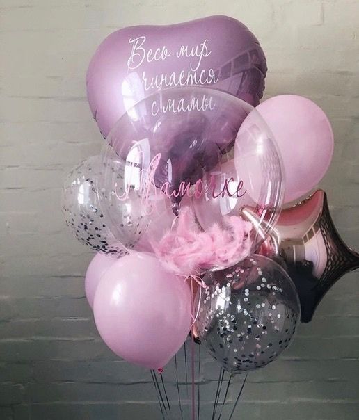- Фонтан из одиннадцати шаров (фольгированное сердце с надписью, большой прозрачный шар баблс с надписью и перьями, 2 шара с конфетти, 2 фольгированные звезды, 5 шаров пастель)