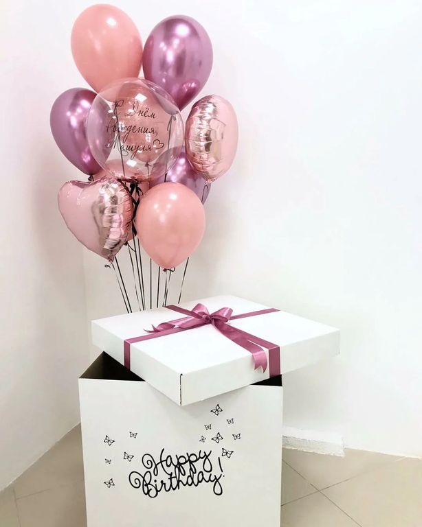 В композиции можно изменить количество шаров, цветовую гамму, надпись на шаре и коробке.