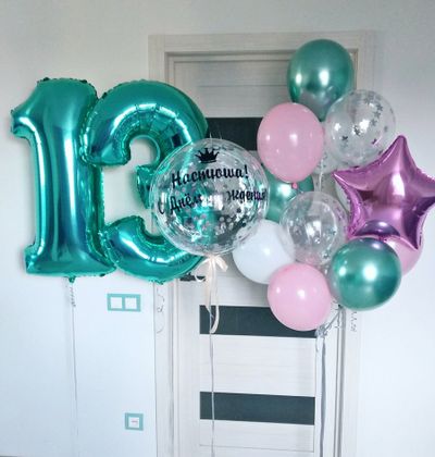 - Фонтан из 13 шаров (1 фольгированная звезда, 3 шара с конфетти, 3 шара хром и 6 шаров пастель)