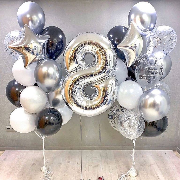 - Два фонтана по семнадцать шаров (1 звезда, 3 шара хром, 3 шара с конфетти, 2 шара с днём рождения, 8 шаров пастель)