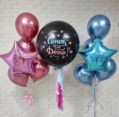 - Большой гендерный шар с кисточками, конфетти и маленькими шарами