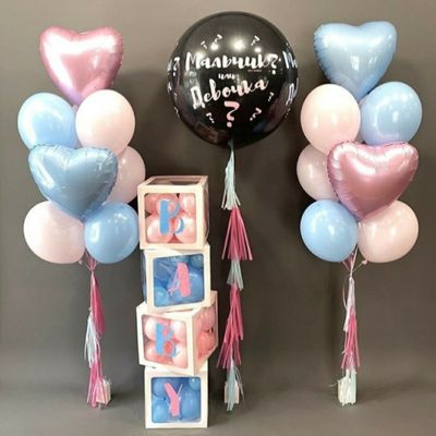 - Большой гендерный шар с кисточками, конфетти и маленькими шарами