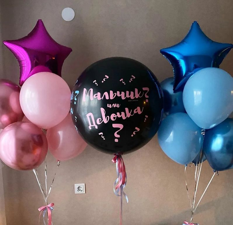 - Большой гендерный шар с кисточками, конфетти и маленькими шарами