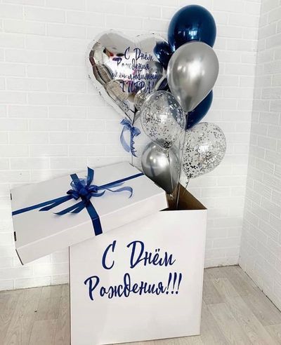 В композиции можно изменить количество шаров, цветовую гамму, изменить надписи на шаре и коробке.