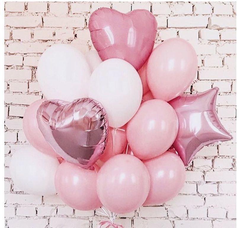 - Фонтан из двадцати шаров (2 фольгированных сердца, 2 фольгированные звезды, 16 шаров пастель)