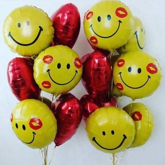 - Два фонтана по девяти шаров (6 фольгированных смайликов, 3 фольгированных сердца)