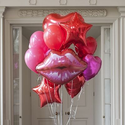 - Фонтан из одиннадцати шаров (фольгированный шар губы, 2 фольгированные звёзды, 3 фольгированных сердца, 5 шаров пастель)